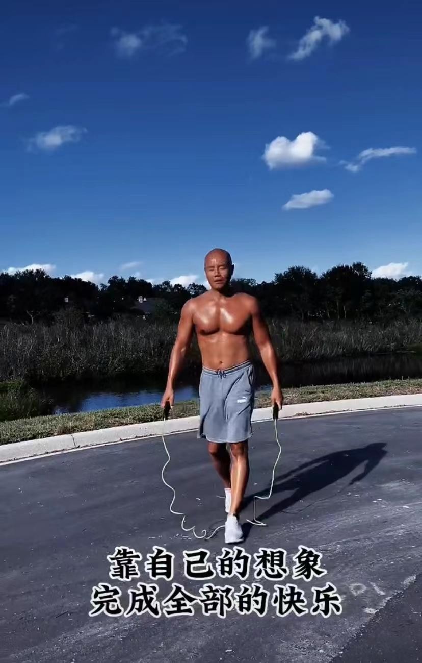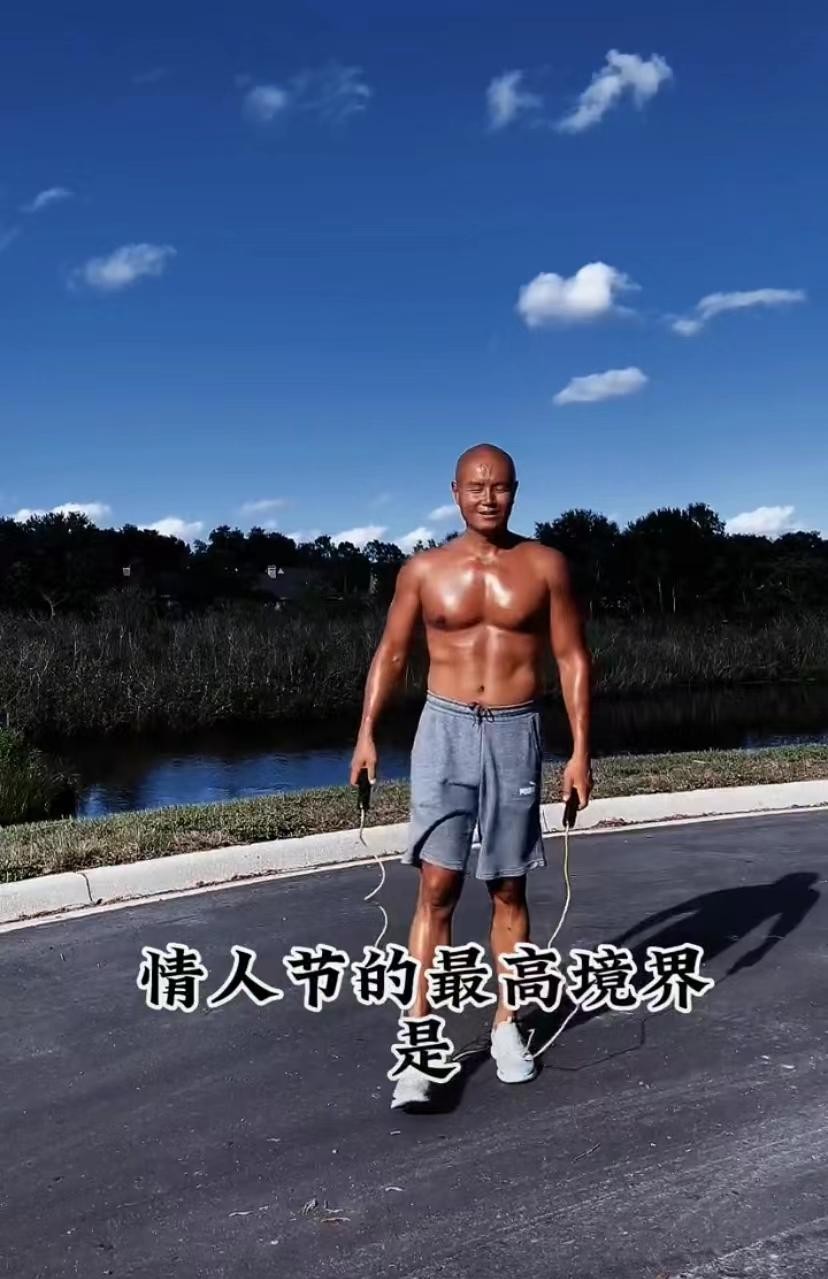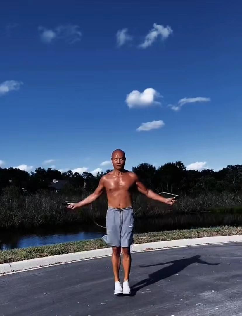 从画面中可以看出,当天的太阳很晒,而乐嘉却好似感受不到一样,站在太阳底下跳绳锻炼,身上的皮肤已经晒到发红发亮,搭配上他标志的光头形象,整个人好似铜人一般。