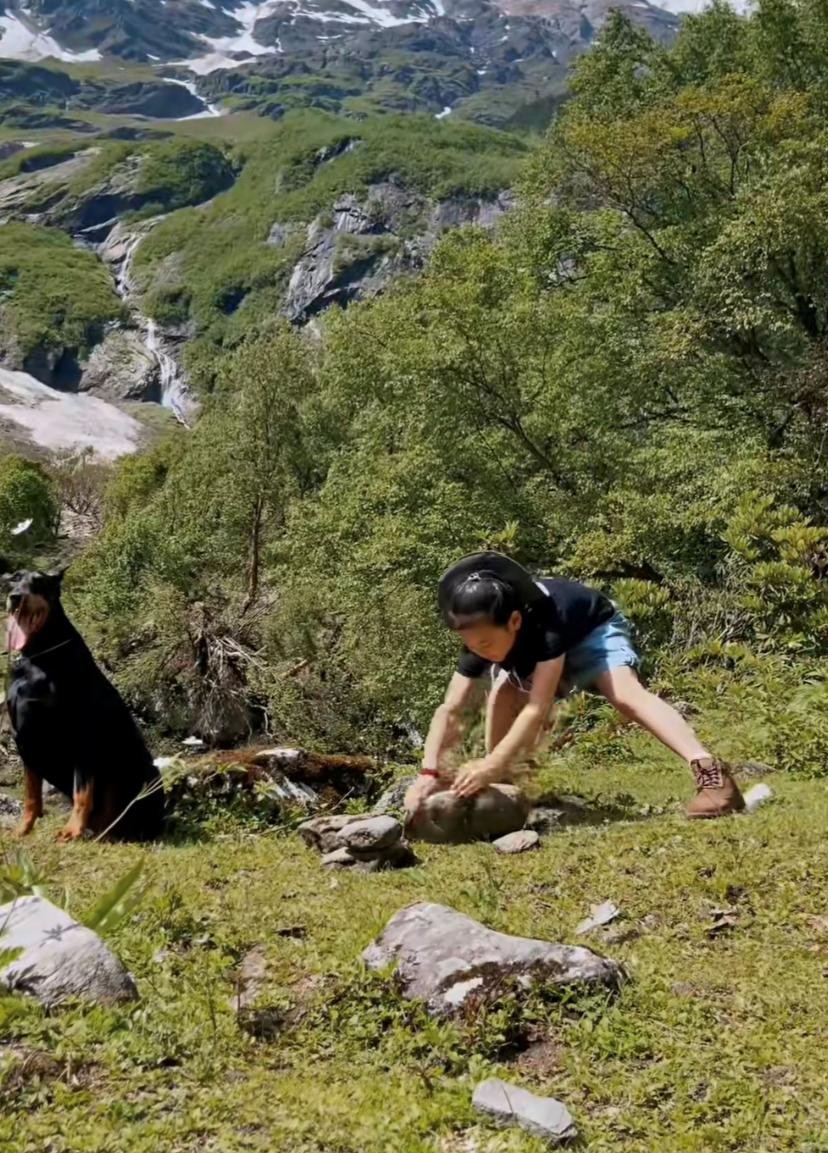 父女俩带着一条狗爬到了海拔3200米的高峰,灵儿跪拜的模样也十分虔诚。