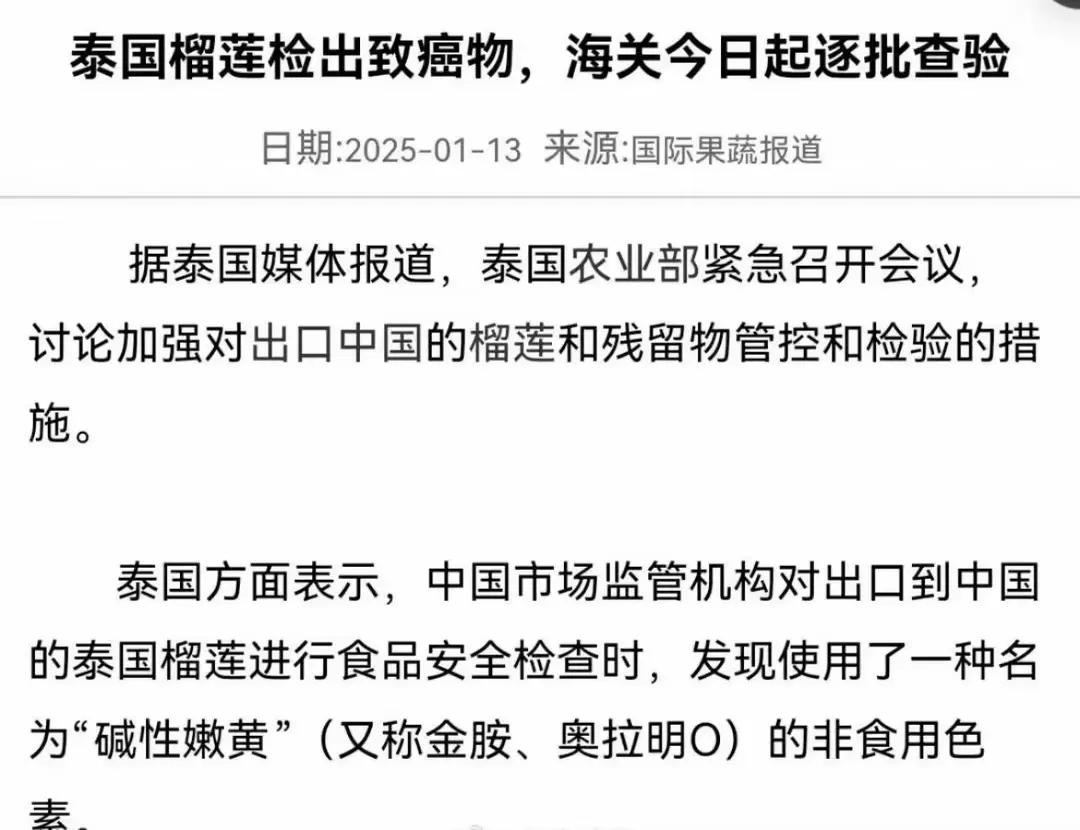 事件发生在2025年1月,泰国出口的榴莲在中国海关抽检时被发现含有一种被称为“碱性嫩黄”的致癌物。这种物质对人体的肾脏和皮肤有严重危害,因此,超过100个集装箱的榴莲被中国海关拒绝进口。