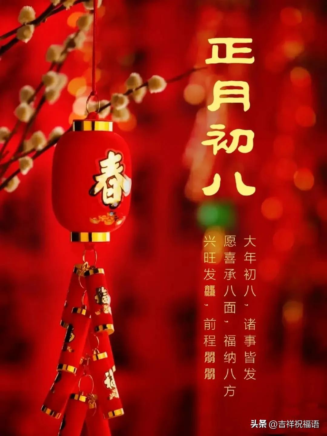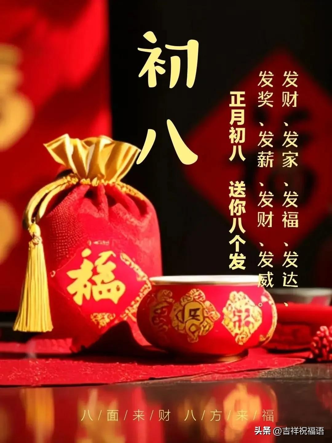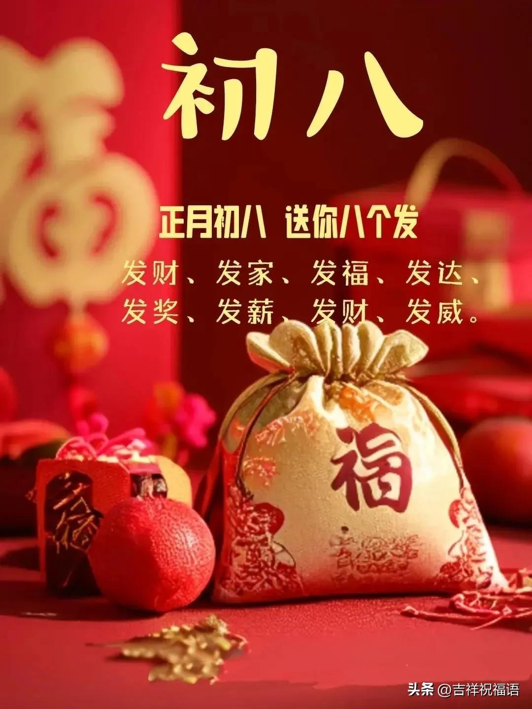 大年初八想要发,发送祝福传万家,传给你如意吉祥把家发,传给他幸福安康把财发,传给我欢欣鼓舞短信发,吉祥祝福语祝你万事金安、好运相连!