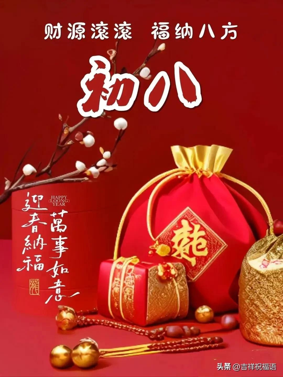 初八到来喜洋洋,福气滚滚幸福香。好运降临心花开,财源滚滚笑不悔。家庭幸福和乐融,友情真诚真心传。初八祝福送真情,快乐幸福继长长!