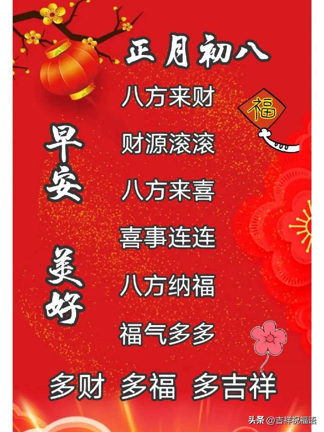 大年初八,大福大发发财日!祝你2025年:大富大贵发大财,小财小财一起发,八方来财发发发!衷心祝愿我的亲人和朋友:天天福星照,年年好运来!愿你身体健康无恙;愿你平安如意吉祥!初八快乐!早安吉祥!