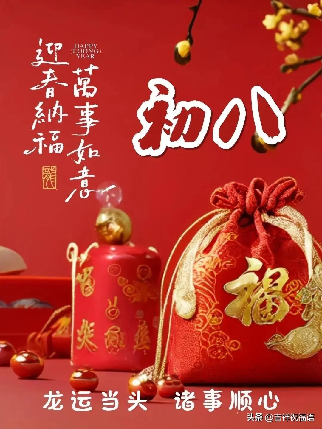 轻轻地问候带来福气,浓浓的情谊送来美满!正月初八,祝您龙年走好运,事业家庭双丰收,爱情美满甜如蜜,家庭和睦幸福来,愿您事事都顺心!