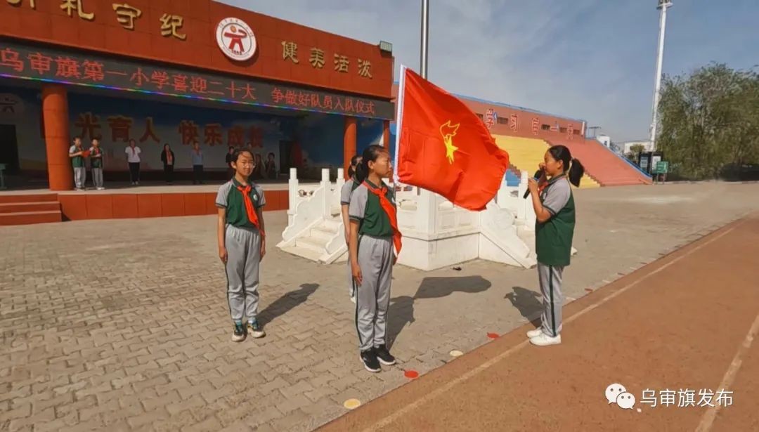 活动上,乌审旗实验小学老队员为110名入队的新队员佩戴红领巾,共同见证了新队员入队的光荣时刻。通过入队仪式,让孩子们感悟光荣感、提升自豪感、升华使命感,从而树立起热爱红领巾、争做好队员、当好接班人的坚定信念,时刻准备着为实现中华民族伟大复兴的中国梦而奋斗,以奋发向上的精神状态迎接党的二十大胜利召开。