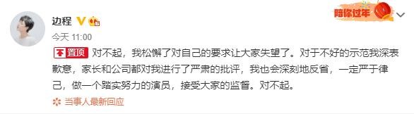 4月26日,针对网上传播的抽烟视频,演员边程发文道歉。他表示:“松懈了对自己的要求让大家失望了。对于不好的示范深表歉意。”坦言自己会“深刻地反省,一定严于律己”。
