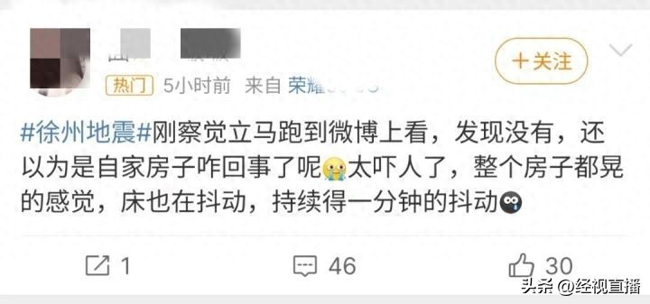 3月21日一大早,江苏徐州,有网民在社交平台上发文称,感觉到整个房屋摇晃,床也在震动,持续约一分钟,怀疑是地震来袭。