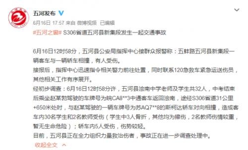 6月16日,据中共五河县委对外宣传办公室官方微博@五河发布发布通报称,6月16日12时58分,安徽省蚌埠市五蚌路五河县新集段,一辆客车与一辆轿车发生相撞,目前统计客车内刚参加完中考的32名师生及轿车内5人均不同程度受伤。