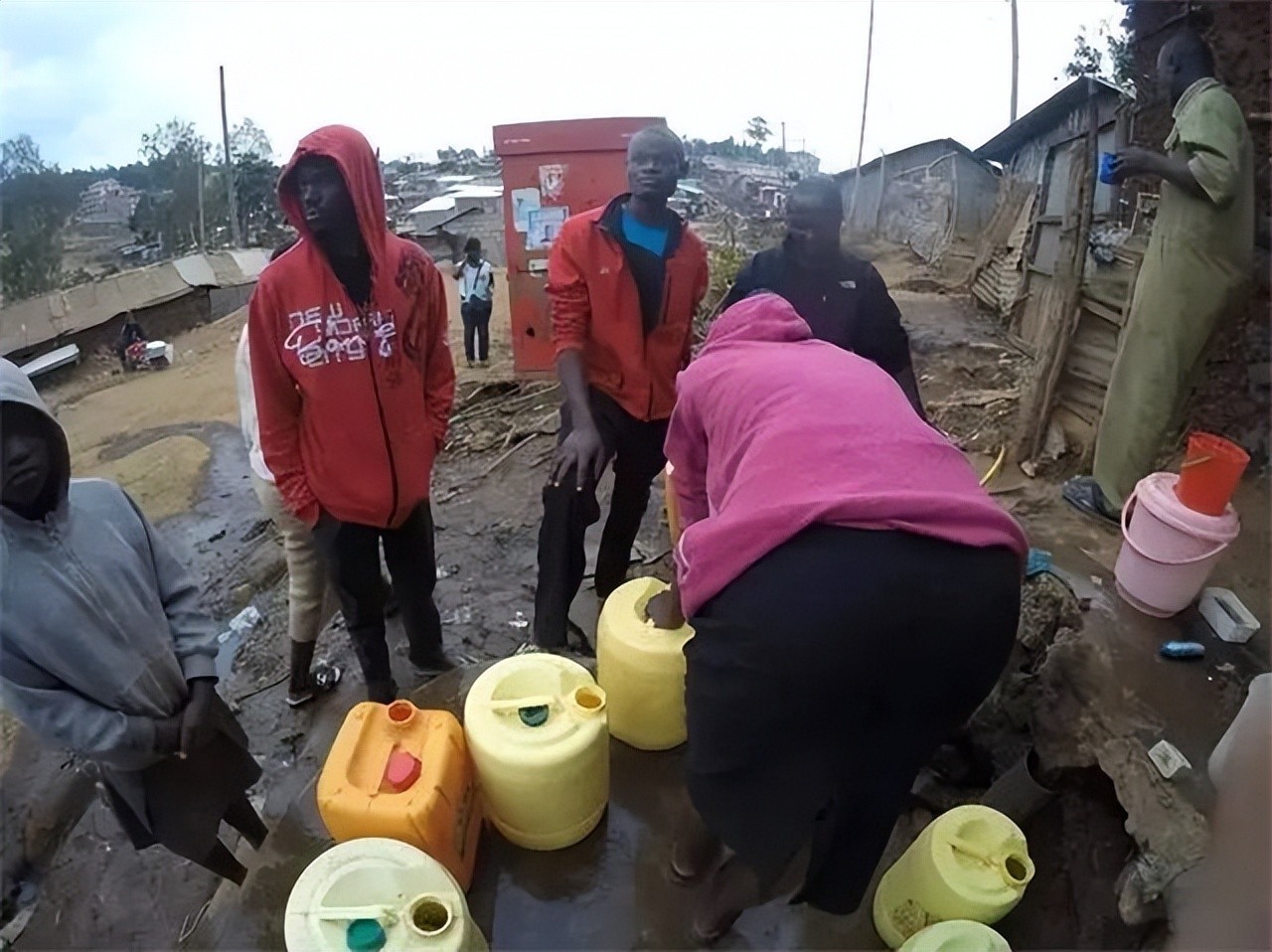 贫民窟里有两条河,河水是黑色的,上面还漂浮着垃圾。生活在这里的人找不到其他水源,就拉一根水管,将河水引到家里,烧开了直接喝。