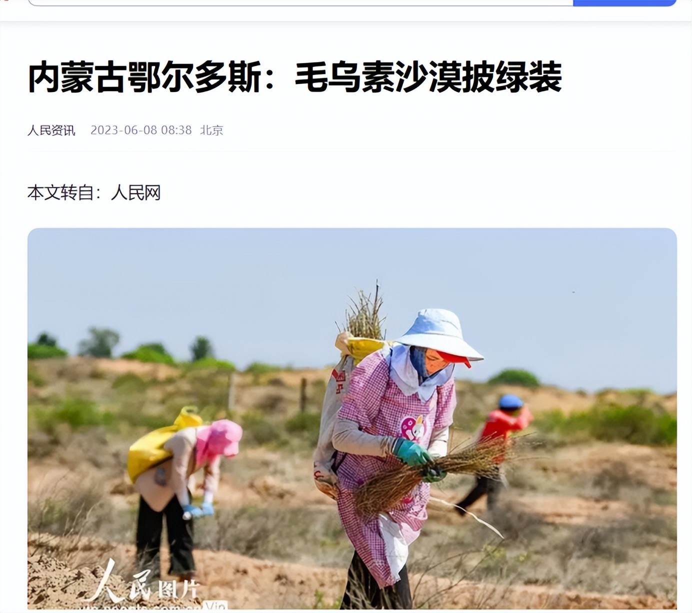 人民咨询 2023年6月8日 关于《内蒙古鄂尔多斯:毛乌素沙漠披绿装》的报道