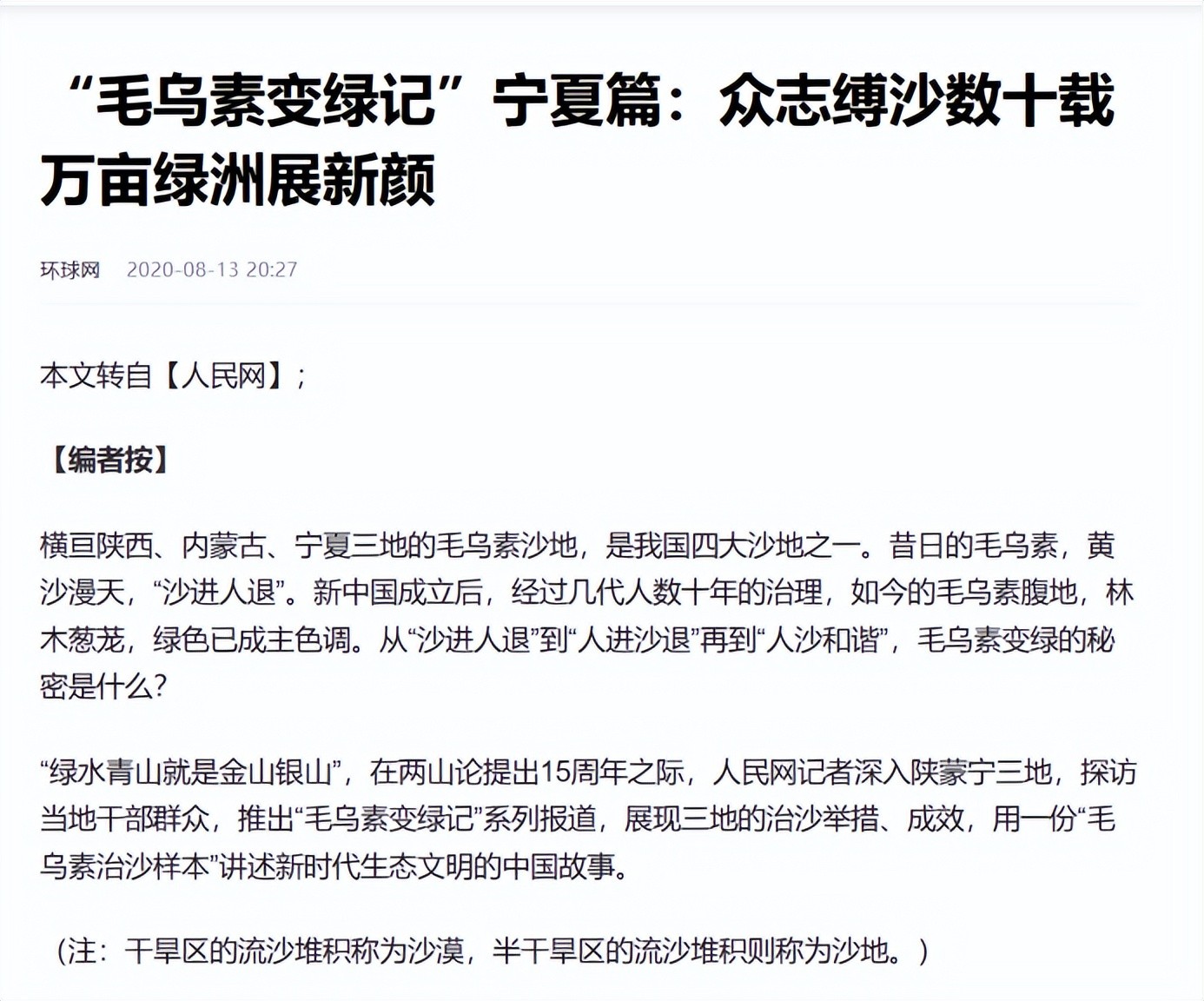 信息来源:环球网 2020年8月13日 关于《“毛乌素变绿记”宁夏篇:众志缚沙数十载 万亩绿洲展新颜》的报道