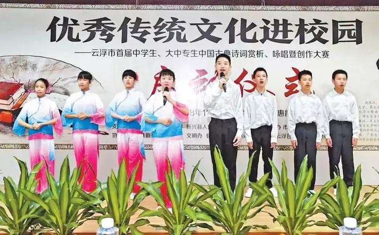 再次,学校大力借助各种大型活动,助力传统文化进校园建设,为学校的校园文化建设添光加彩。由云浮市文明办、市教育局和云浮日报社联合举办的优秀传统文化进校园——云浮市首届中学生、大中专生中国古典诗词赏析、吟唱暨创作大赛启动仪式在新兴县惠能中学举行(如图),掀起了惠能中学文化传统进校园活动的热潮,引起了社会的强烈反响,赢得了各方的一致好评,为惠能中学的校园文化建设增添了亮丽的一笔。还有该校每年举行的文艺晚会都会有大量展示传统文化内容的节目,一大批极具传统文化内涵的武术、歌舞、朗诵、短剧等节目的演出,受到了全校师生以及来宾的热烈欢迎和社会各界的称赞。