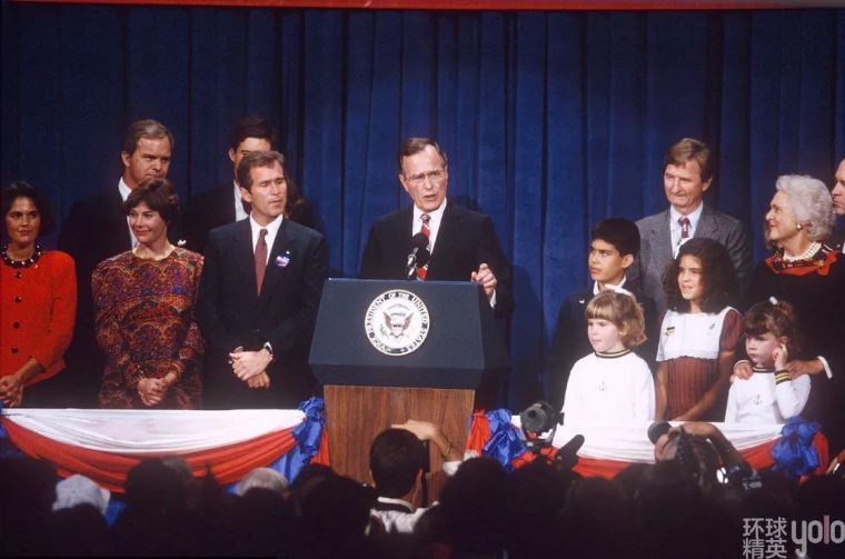 1988年,在里根的支持下,布什赢得共和党总统候选人提名,在大选中击败了马萨诸塞州州长迈克尔·杜卡基斯,成为了美国第51届41任总统。在四年的总统任期内,尽管在外交和军事上取得了一些成就,但由于国内经济问题压力巨大,1992年老布什谋求连任失败。