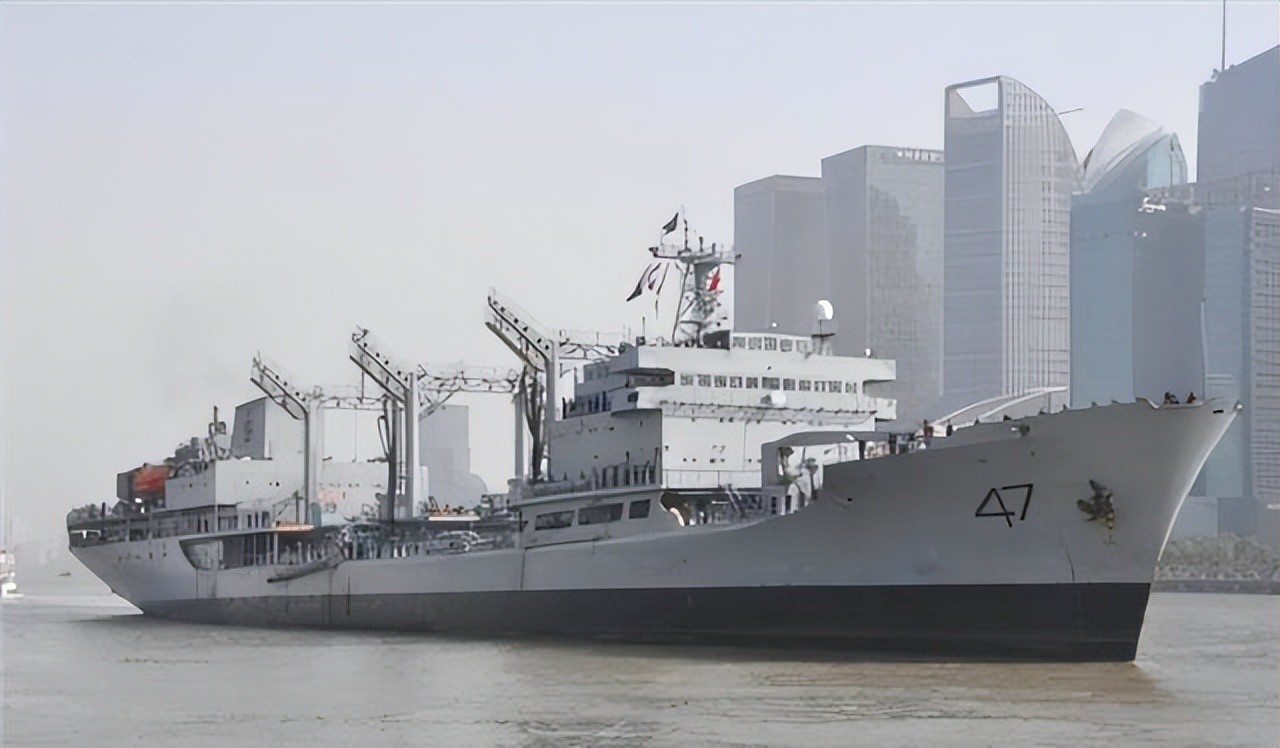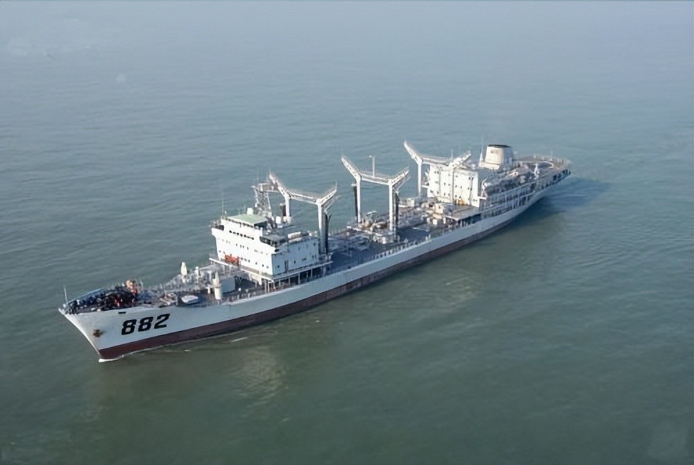 905型“太仓”级补给船(北约代号福清级) ,我国第一艘油水干货补给船,也是人民解放军首型补给舰。上层建筑分前后两部分,中部设有4个油水补给站和2个干货补给站,舰体尾部设有直升机起降平台,可以实现垂直补给,但未设机库。可一次携带燃料10550吨,轻柴油1000吨,补给水200吨,饮用水200吨以及冷藏食品50吨