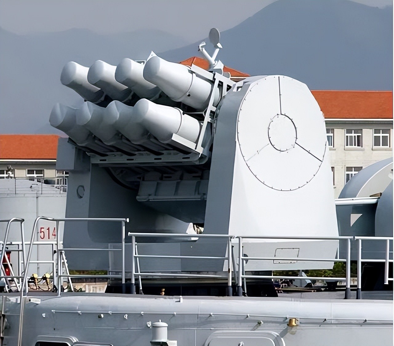 1座8联装海红旗-7防空导弹,是法制“海响尾蛇”防空导弹的国产化改造提升版本,射程15公里,提供点防空和反导能力。