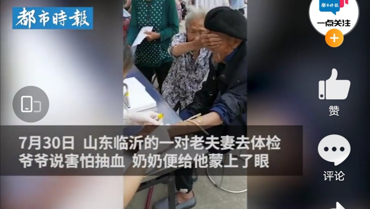 今天在新闻里看到一个非常暖心的画面,山东临沂的一对老夫妻,98爷爷和100岁奶奶一起去体检。到了抽血的环节,爷爷说害怕,本来奶奶也要抽血的,听了之后跟体检的工作人员说,“你等一下,我老头害怕打针”,然后就伸手蒙住了爷爷的眼睛。