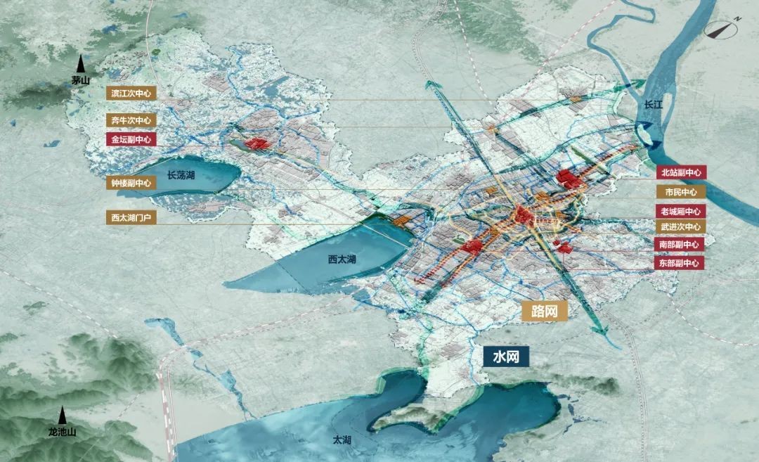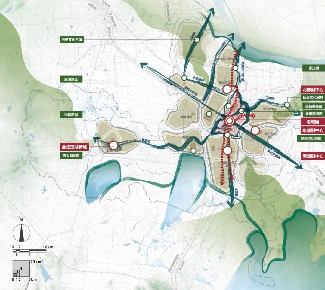 五心:激活老城厢、北部副中心、东部副中心、南部副中心及金坛滨湖新城5个特色中心。