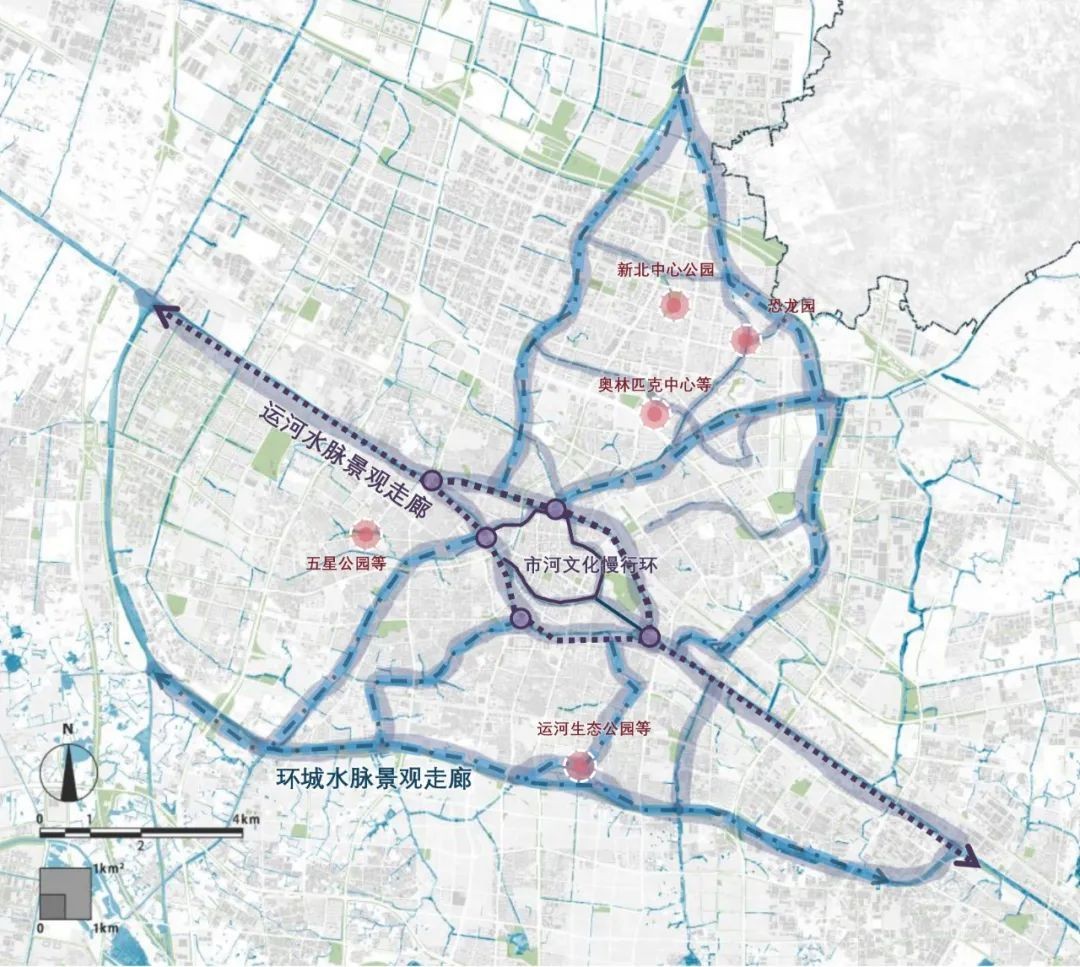 环城水脉景观:依托澡港河、新运河、北塘和,串联常州恐龙园、常州奥林匹克中心、运河生态公园等核心区内的重要景观开敞空间,形成核心区都市景观畅览路径。