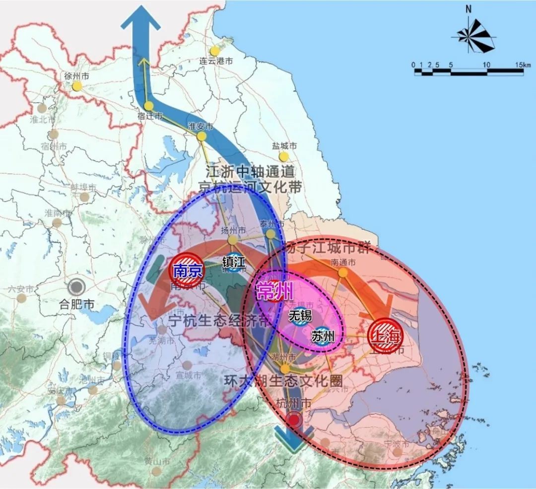 强化上海、南京、苏锡常三大都市圈叠加区位优势,打造传动轴,建设成为长三角重要支点城市。