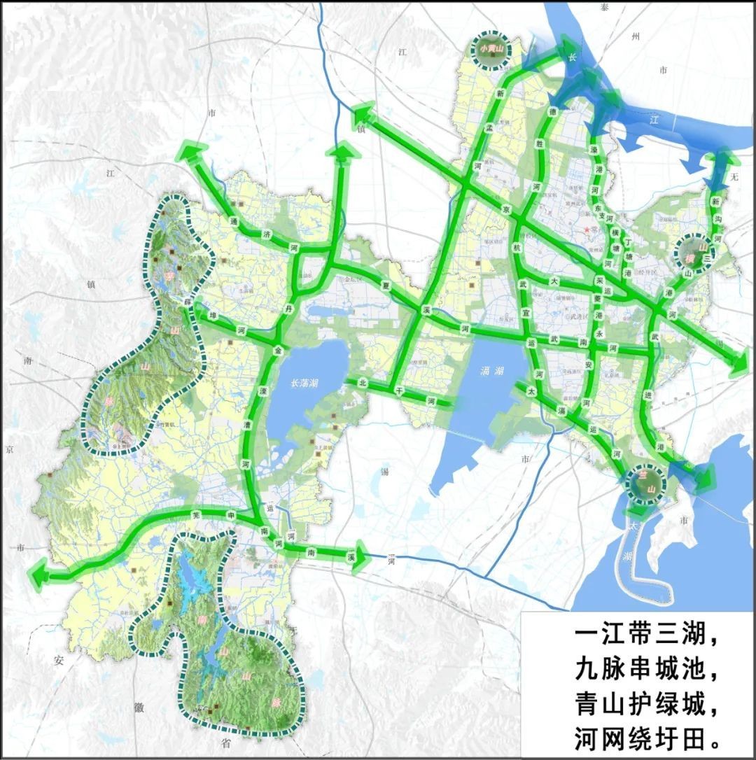 构建“一江带三湖,九脉串城池,青山护绿城,河网绕圩田”的市域生态空间网络。落实国家要求,划定并严格保护生态红线。