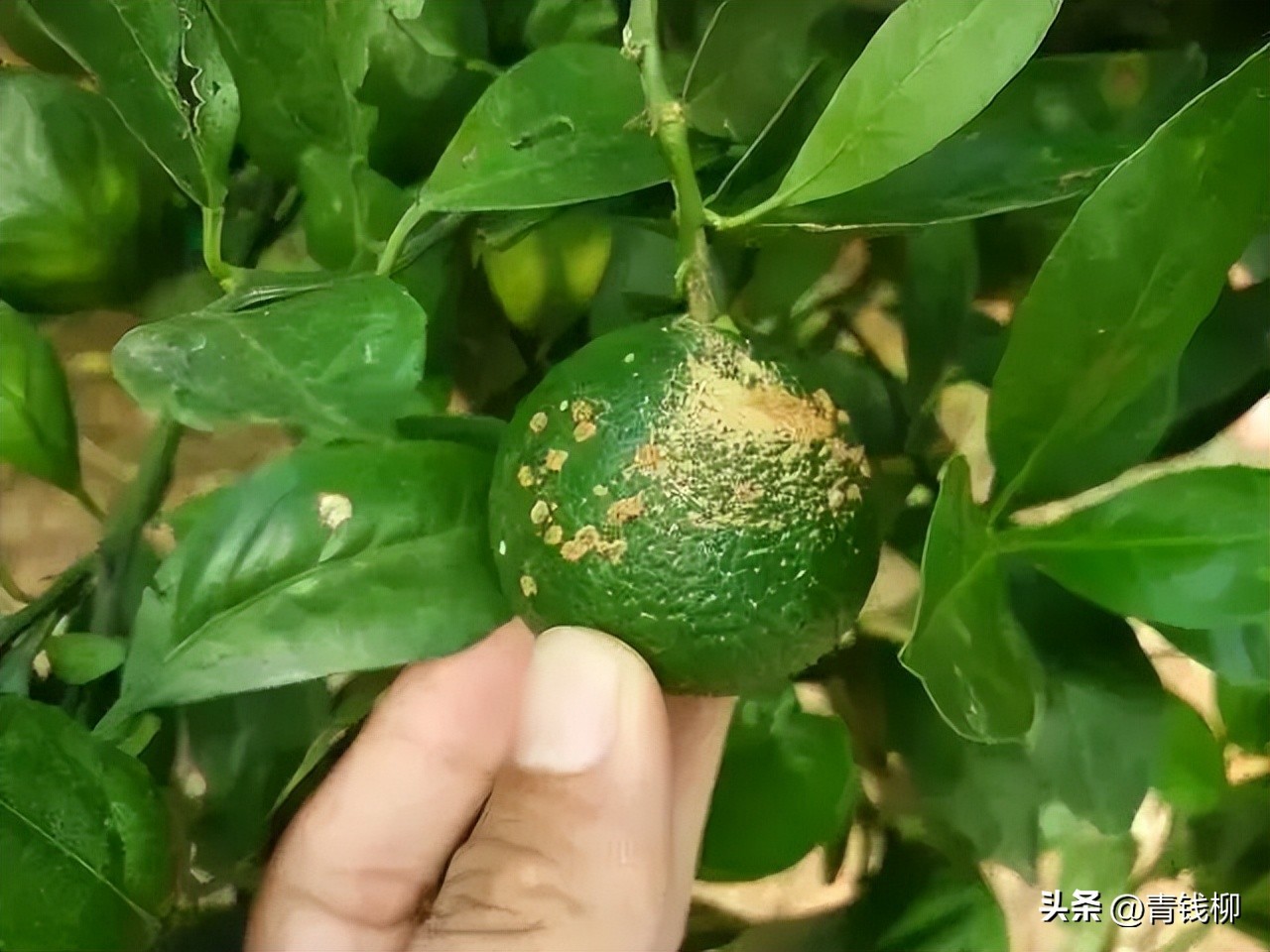 新梢受害症状与叶片相似,但凸起不明显,病斑分散或连成一片,枝梢短小扭曲。花瓣受害很快脱落,果实受害后,在果皮上常长出许多散生或群生的瘤状突起,幼果发病多呈茶褐色腐烂脱落,稍大的果实发病产生黄褐色木栓化的突起,畸形易早落,果实中期发病,病斑往往变得不太明显,但皮厚汁少;果实后期发病,病部果皮组织一大块坏死,呈藓皮状剥落,下面的组织木栓化,皮层较薄,久晴骤雨常易开裂。