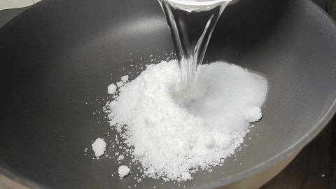 8. 另起锅加入一碗白糖,一碗清水,用铲子不停推动,