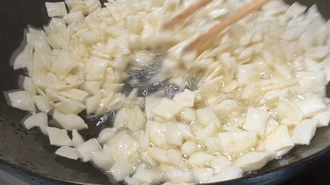 6. 起锅烧油,烧至5成热,用筷子试一下,然后下入切好的饺子皮丁