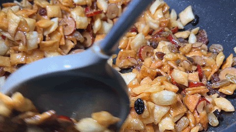 4、 将炸过的饺子皮,葡萄干,枣片,炒至裹浆