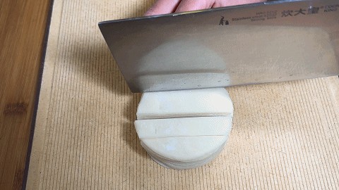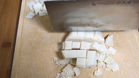 1. 饺子皮用刀切成宽条,再改刀切成小方块