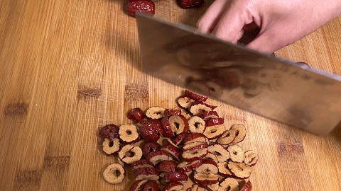 3. 将无核的小枣切成枣片,放入大碗中,再加入三色的葡萄干