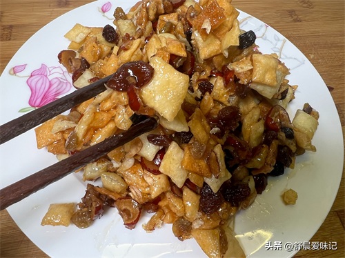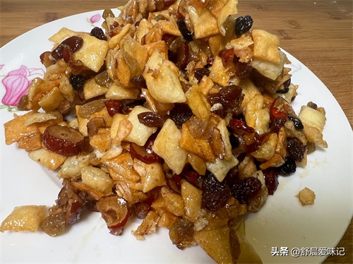 11. 倒入炸好的饺子皮丁,枣片和葡萄干,用铲子搅动上浆