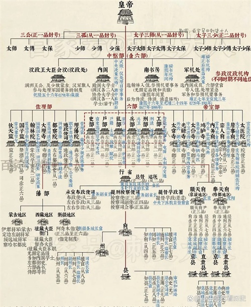 政治体制:清朝实行君主专制政体,皇帝拥有至高无上的权力。中枢机构包括军机处、内阁、六部等,负责处理国家事务。