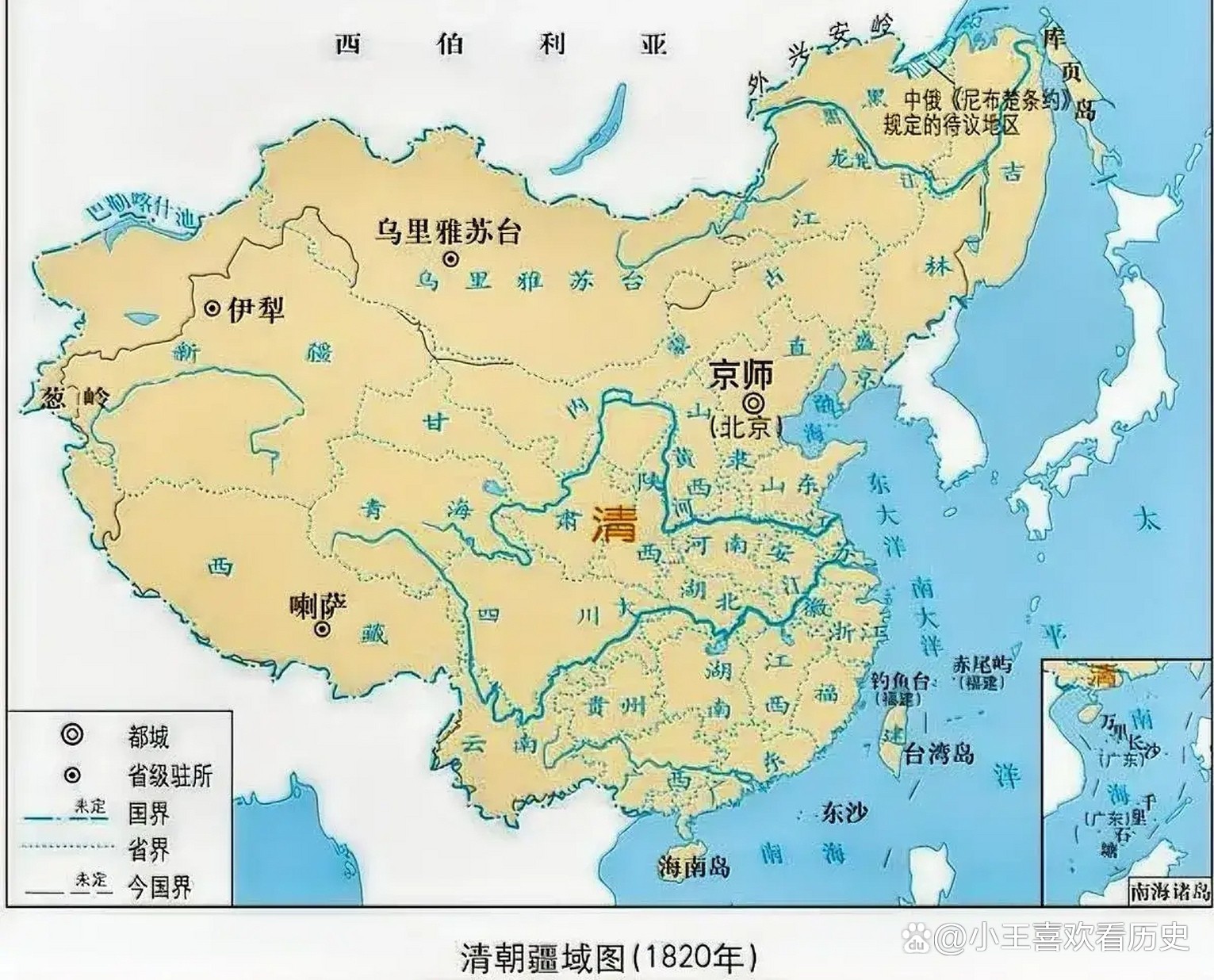 疆域:清朝的疆域辽阔,全盛时期西抵葱岭和巴尔喀什湖,西北包括唐努乌梁海,北至漠北和西伯利亚,东到太平洋(包括库页岛),南达南沙群岛。疆域面积在1820年达到1316万平方公里(1790年代含羁縻地达1470万平方公里)。