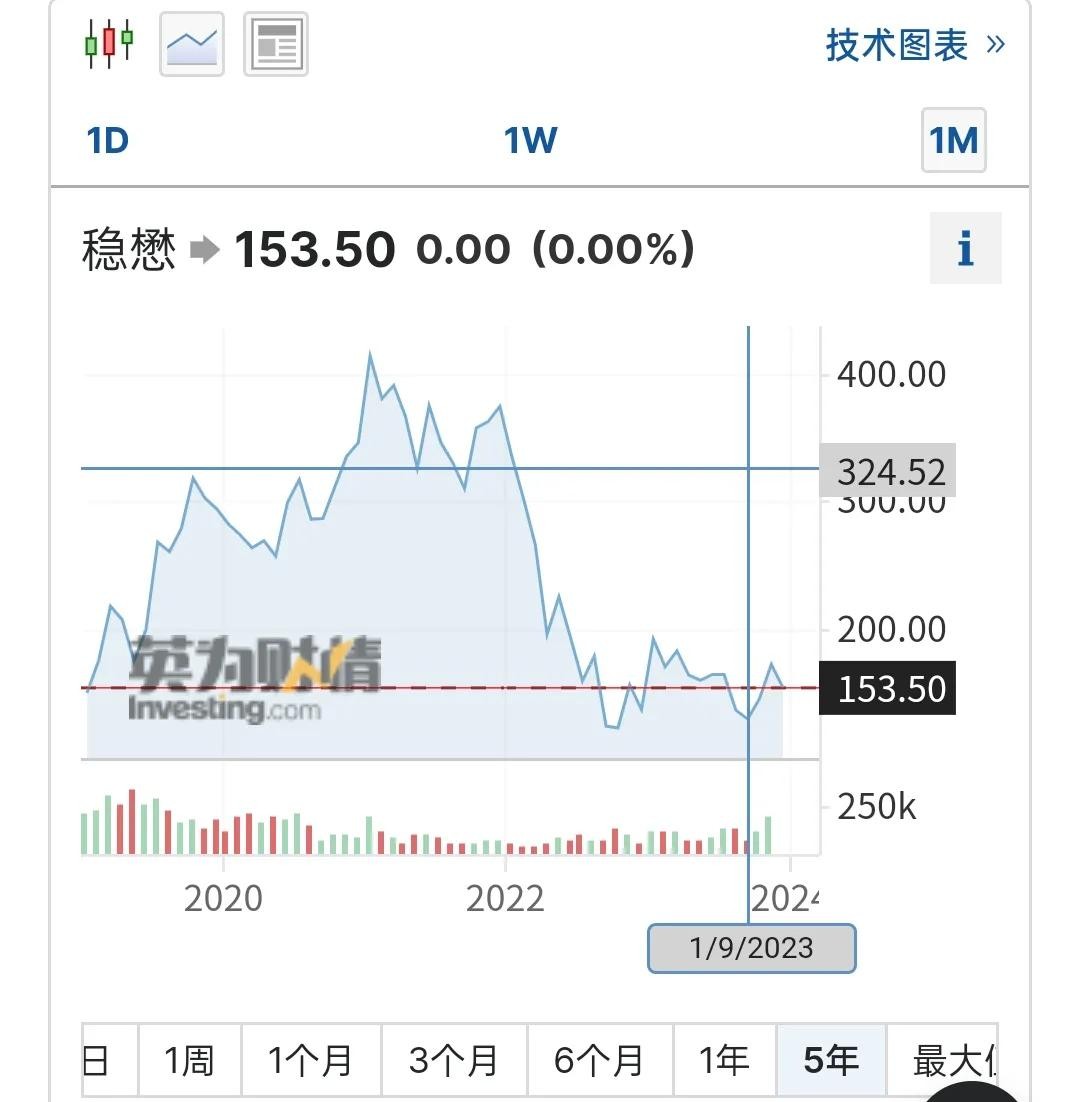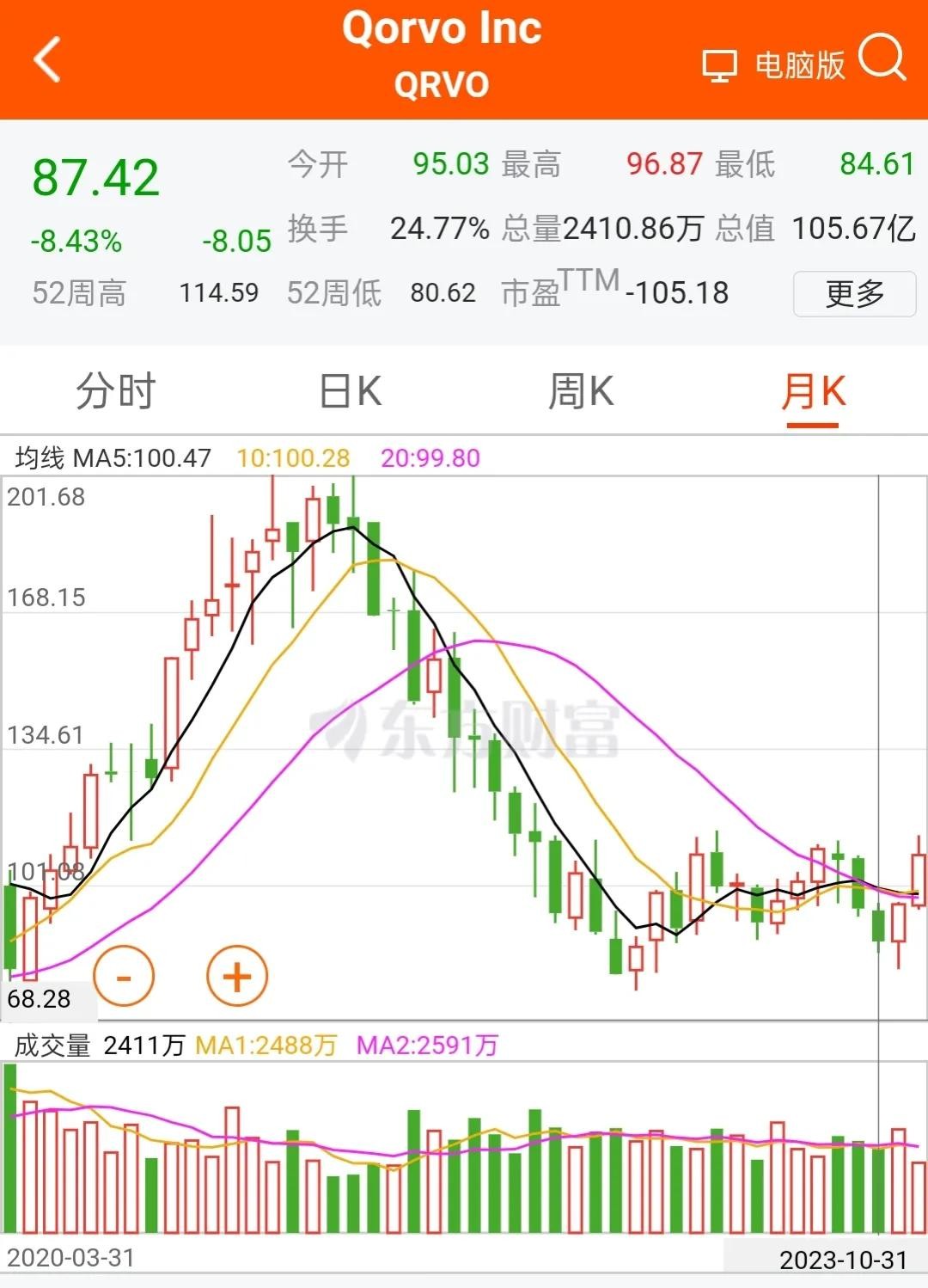 来看本文主角Qorvo科沃股票,2023年比 2021年跌了5倍,回到解放前。