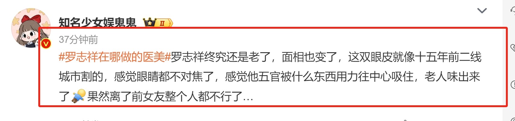 照片中,罗志祥的双眼皮显得尤为突兀,有网友戏称这双眼皮像是十五年前在二线城市割的,甚至调侃说感觉他的眼睛都不对焦了。