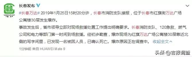 2019年1月25日15时20分许,长春市消防支队接报,位于长春市红旗街万达广场公寓楼30层发生爆炸。