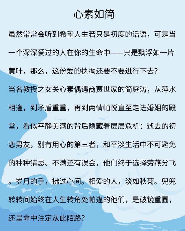 《心素如简》讲述的是关心素和简庭涛两人之间的爱情故事。简庭涛属于商贾世家,家境优渥,关心素是教授之女,简庭涛追了关心素很长一段时间,但关心苏依然好大一棵树般,任尔东南西北风,我自岿然不动。
