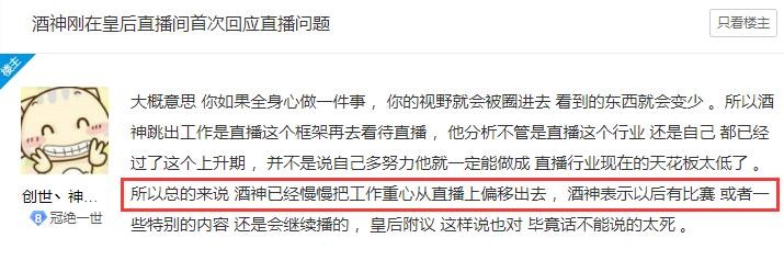 虽然可能会减少直播了,但是酒神还是说依旧会有机会直播的,比如有比赛或者特别内容的时候依旧会开播和各位粉丝互动的。