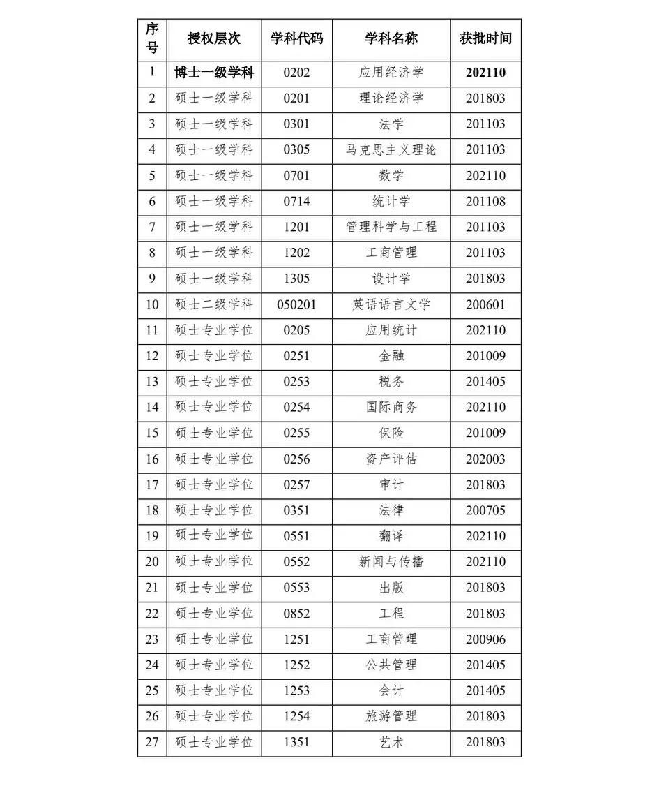 学校有1个博士学位授权一级学科点(应用经济学)、9个硕士学位授权一级学科点、17个硕士专业学位授权点。具体学科见下表: