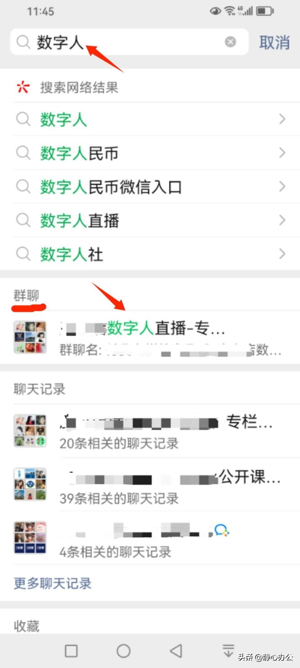 第2步:在打开的搜索界面中输入微信群聊的名称,如果不记得完整名称也不要紧,输入群聊名中的关键词即可。这里输入“数字人”。在下方的搜索结果中,就会出现名称中包括“数字人”的微信群聊。