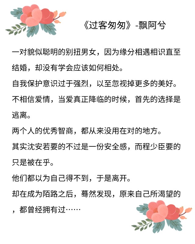 点评:《过客匆匆》是我刷过几次的小说之一,程少臣一直都想要个孩子,只是他表面上并没有表现出来,后来两人走到离婚这一步。但离婚后,发现非彼此不可。