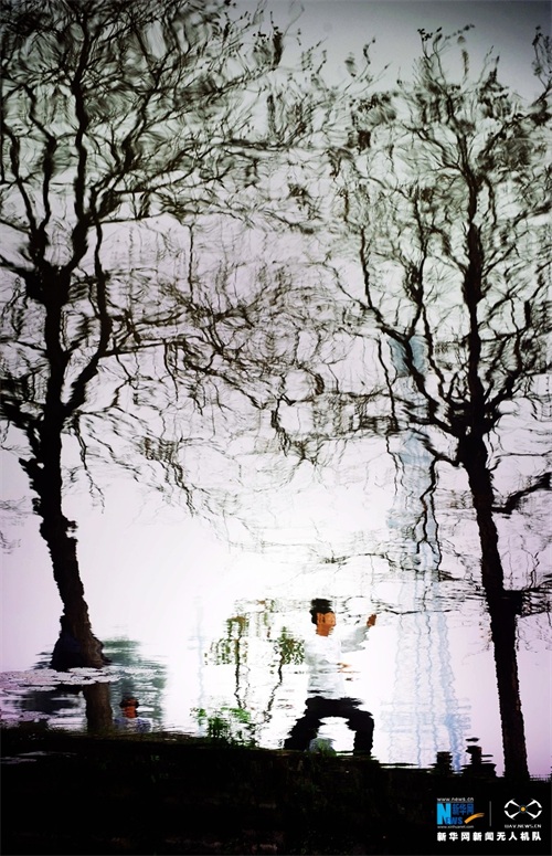 湖水与锻炼者的倒影相映成趣。新华网发