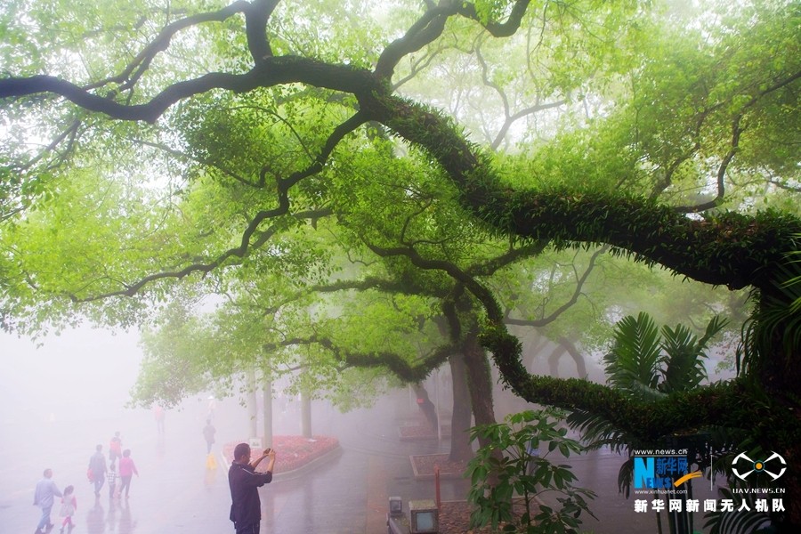 雨雾弥漫的中山公园,依然吸引很多市民前来休闲。新华网发(邓活生 摄)
