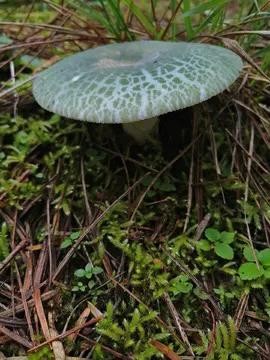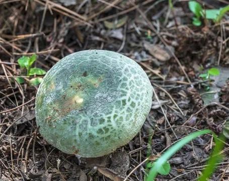 美味青头菌头部为绿色,脚步和伞部菌肉为白色,本身具有与青草一般的保护色,不容易发现,中部常稍下凹,不粘,浅绿色至灰绿色,表皮往往斑状龟裂,老时边缘有条纹。