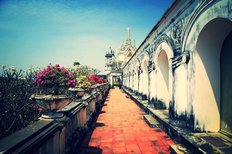 从曼谷去华欣的路上,我们参观了两座昔日泰皇的行宫。第一座是拉玛四世的“考汪皇宫”,拉玛四世就是著名好莱坞电影《安娜与国王》里的华人影星周润发饰演的那位皇帝。传说他因为钟爱考汪山的灵秀气息,于是1860年命人在山顶建起泰国有史以来第一座夏日行宫。整座行宫的建筑中泰合璧,独树一帜。最吸引游人的是皇室人员礼佛之地———Kaeo Noi寺以及那座雄踞行宫中心的白色的PhrathatChomphet塔。我们是坐着小缆车上去的,一路上看见很多猴子,工作人员说这些猴子不怕生人,但千万不要逗它们,如果被惹恼它们也会袭击人。