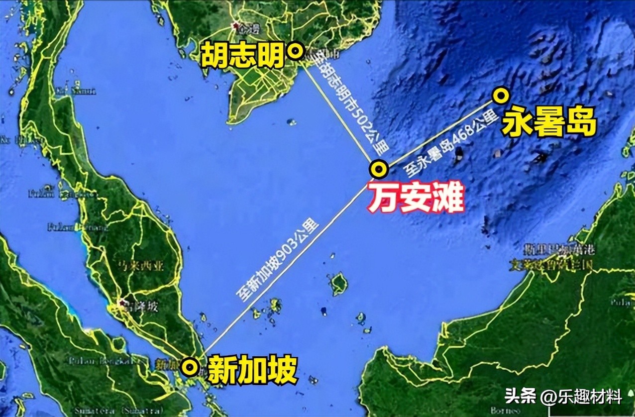 万安滩位于南沙群岛西南部,滩面东西长约63公里,平均宽约为11公里,面积约为700平方公里,海水深度最浅位置只有17米左右,适合建立天然良港和大型中转基地。