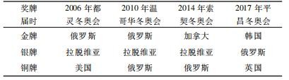 通过对2006年到2017年的冬奥会钢架雪车项目(男子单人)获奖情况进行统计,发现在这四届冬奥会上,获得钢架雪车奥运会奖牌最多的国家始终是俄罗斯。