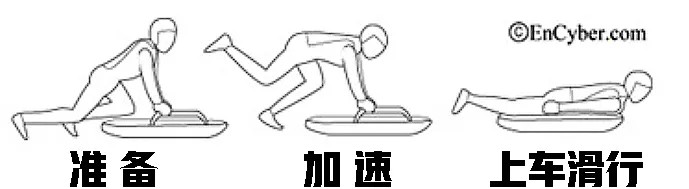 √ 比赛出发的信号灯亮起之后,参赛选手通过助跑加速,使得雪车得到一定初速度之后,选手迅速登上雪车并以俯卧姿势进行比赛。滑道上全程保持俯卧状态,中途可以下车,但是冲刺终点的时候需要保持俯卧在车上。