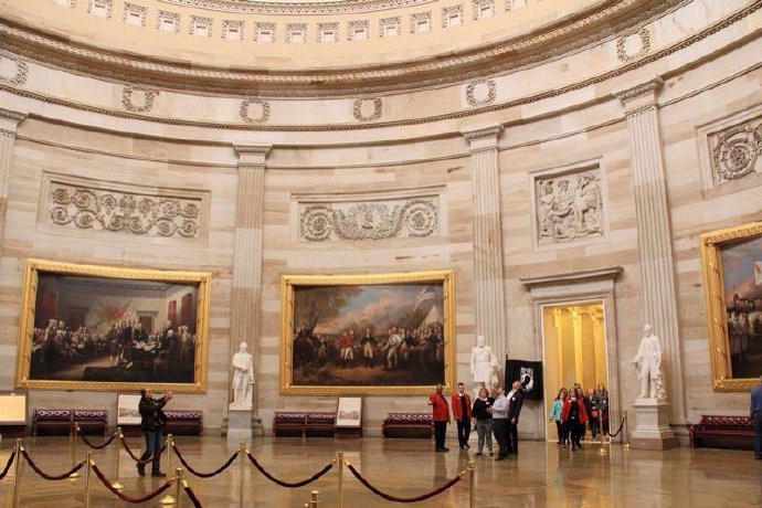 国会大厦供游客免费参观,在最吸引人的中央圆形大厅的墙壁上挂着八幅巨大的壁画,讲述了美国早期的八个重大历史事件。
