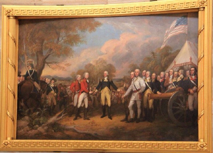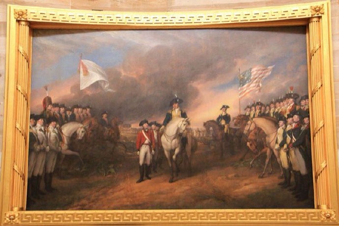 1781年3月,康华里将军率领南方英军主力撤退至海港城市约克敦等待支援,8月,华盛顿率领1.6万人的美法联军包围约克敦,9月,英国舰队赶来支援,却因敌不过25艘一字排开的法国舰队,而被迫撤退,10月,在华盛顿军炮火的猛烈攻击下,走投无路的康华里率领八千余名士兵投降。