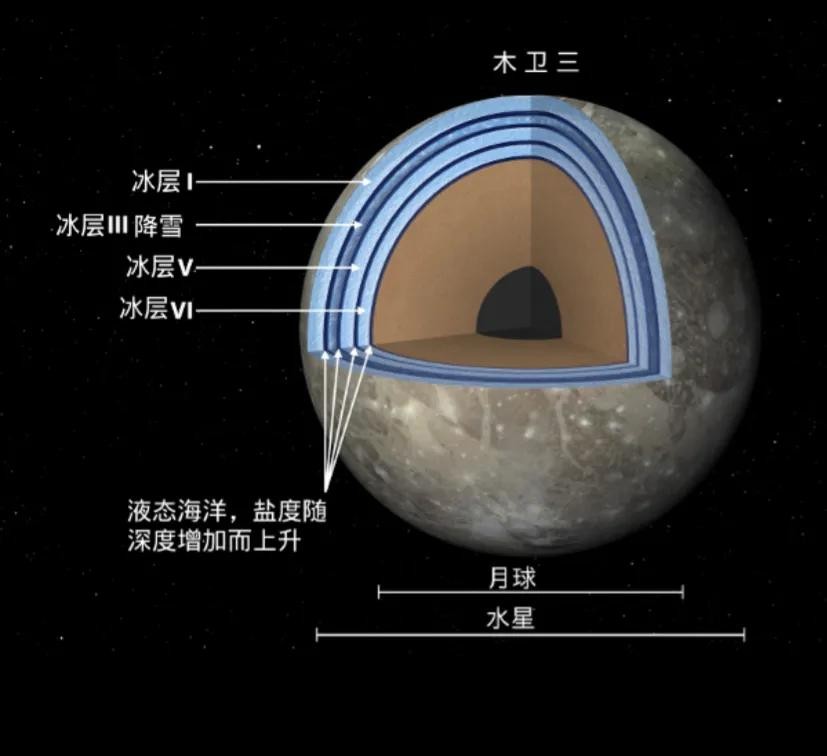 木卫三的表面由几乎相等的岩石和水冰所构成,因为木卫三距离太阳遥远,地表平均温度低至零下180摄氏度,星球表面的水只能以冰山的形式广泛分布在地表,冰山的质量占星体总质量的46-50%,在1995年哈勃空间望远镜对木卫三的观测中发现了地表上存在稀薄的、以氧为主要成分的大气,这也从侧面证明了木卫三表面广泛存在的水冰。而在地表二百公里以下,会存在一个全球性的深水海洋,据哈勃太空望远镜的探测,通过分析木卫三的极光光谱,估算出其海洋深达400千米。更有一种可能这只是木卫三全球性海洋的一小部分,木卫三可能拥有三个海洋,三个海洋层层叠加,每层都有400千米的深度,并由高压冰层分隔开,最下面的一层海洋可能直接接触到木卫三的岩石内核。所以木卫三的海洋深度可能超过1000公里,蕴含着超过150亿立方千米的巨大水体,含水量是地球水量的30倍以上。